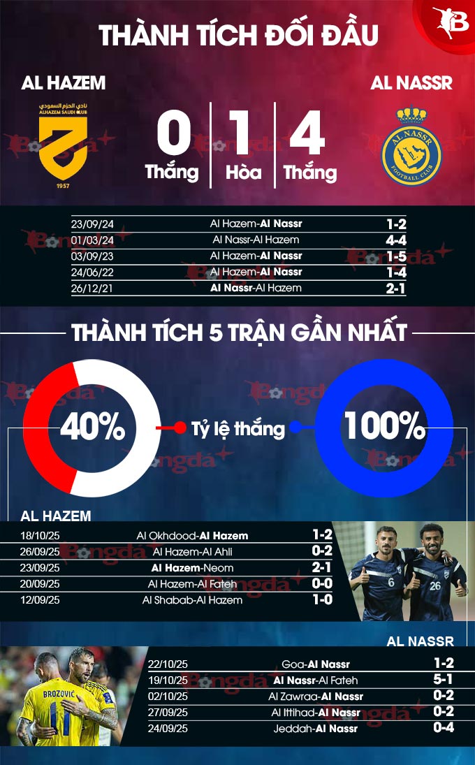 Al Hazem sẽ đối đầu với Al Nassr trong khuôn khổ vòng 6 Saudi Pro League 2025/26. Đội chủ nhà đã xuống hạng ở mùa giải 2023/24 nhưng đã ngay lập tức giành quyền thăng hạng trở lại giải đấu cao nhất Saudi Arabia đầu mùa giải này và sẽ tập trung vào việc tránh xuống hạng như cách đây hai năm.