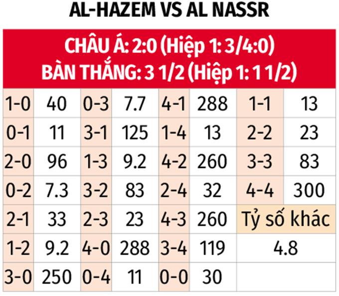 - Tối đa 3 bàn thắng: Al Hazem mới ghi 3 bàn từ đầu mùa, nhưng hàng thủ chỉ để lọt lưới 5 bàn. Với Al Nassr, 3 trận sân khách gần đây họ đều ghi 2 bàn mỗi trận, đồng thời giữ sạch lưới 3 trong 4 chuyến xa nhà gần nhất. Chính vì thế, kịch bản khan hiếm bàn thắng rất có thể sẽ diễn ra.