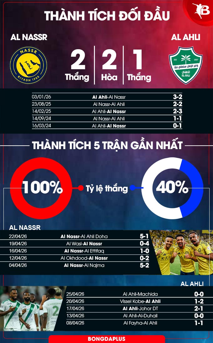 Chuỗi 19 trận thắng liên tiếp, lợi thế sân nhà và khát khao vô địch của Al Nassr khiến họ trở thành ứng cử viên sáng giá hơn một chút. Tuy nhiên, đừng quên Al Ahli đang rất hưng phấn sau chức vô địch cúp C1 châu Á và họ đang bất bại ở cả 2 trận đối đầu Al Nassr mùa này.