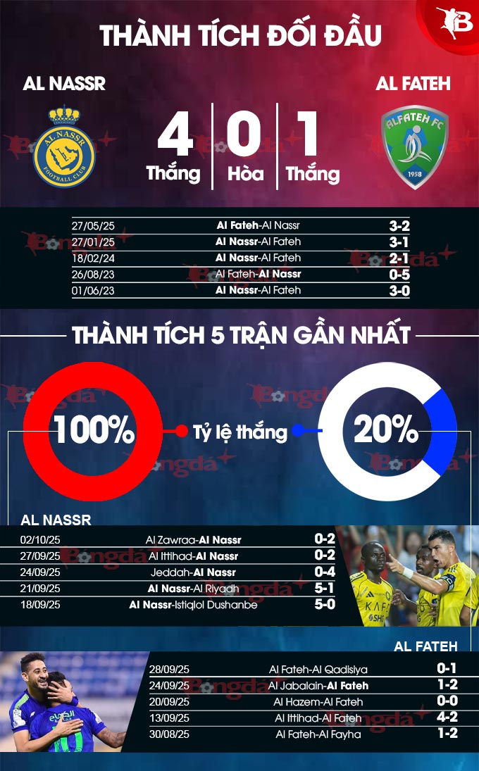 - Từ 3 bàn thắng trở lên: 11/14 trận gần đây của Al Nassr cùng 4/6 trận vừa qua của Al-Fateh đều có ít nhất 3 bàn thắng được ghi. 3/4 trận đối đầu gần nhất thậm chí có tối thiểu 4 pha làm bàn.