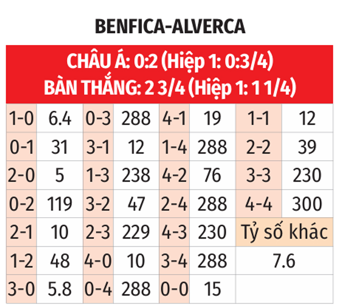 - Lưới rung 15 phút cuối: 4/5 trận đối đầu trước đây giữa Benfica vs Alverca có bàn thắng từ phút 75 trở đi. Chưa hết, 5/8 trận gần đây của Benfica và 3/5 trận vừa xong của Alverca cũng chung kịch bản.