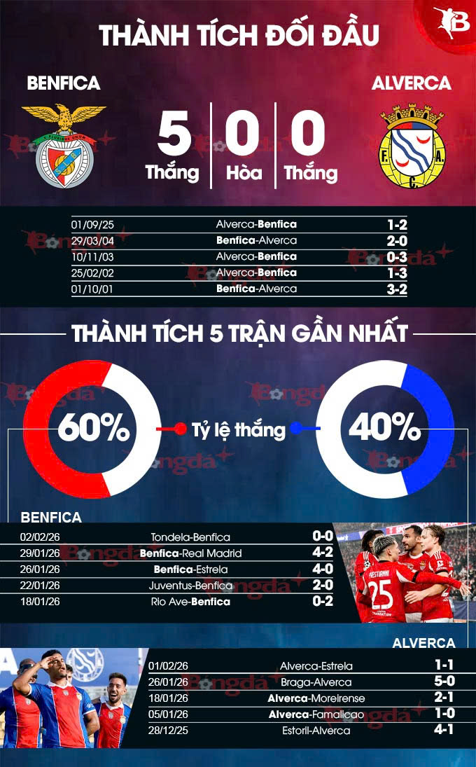 Phong độ của Benfica đang nhỉnh hơn Alverca khi thắng 3/5 trận gần nhất. Trong khi đó, Alverca thắng 2/5 trận vừa xong.