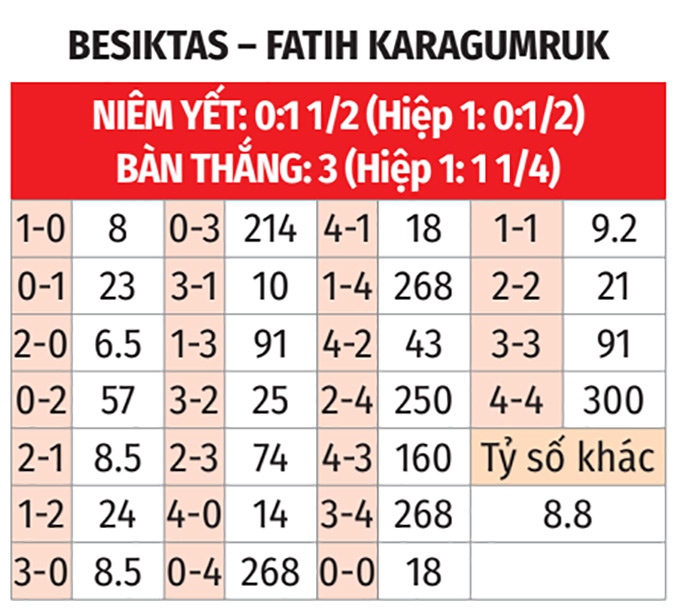 - Tối đa 1 bàn hiệp 1: 6 trận gần đây giữa Karagumruk và Besiktas chỉ có tối đa 1 bàn ở hiệp đấu thứ nhất. 3/4 trận gần nhất của Besiktas cũng có diễn biến tương tự.