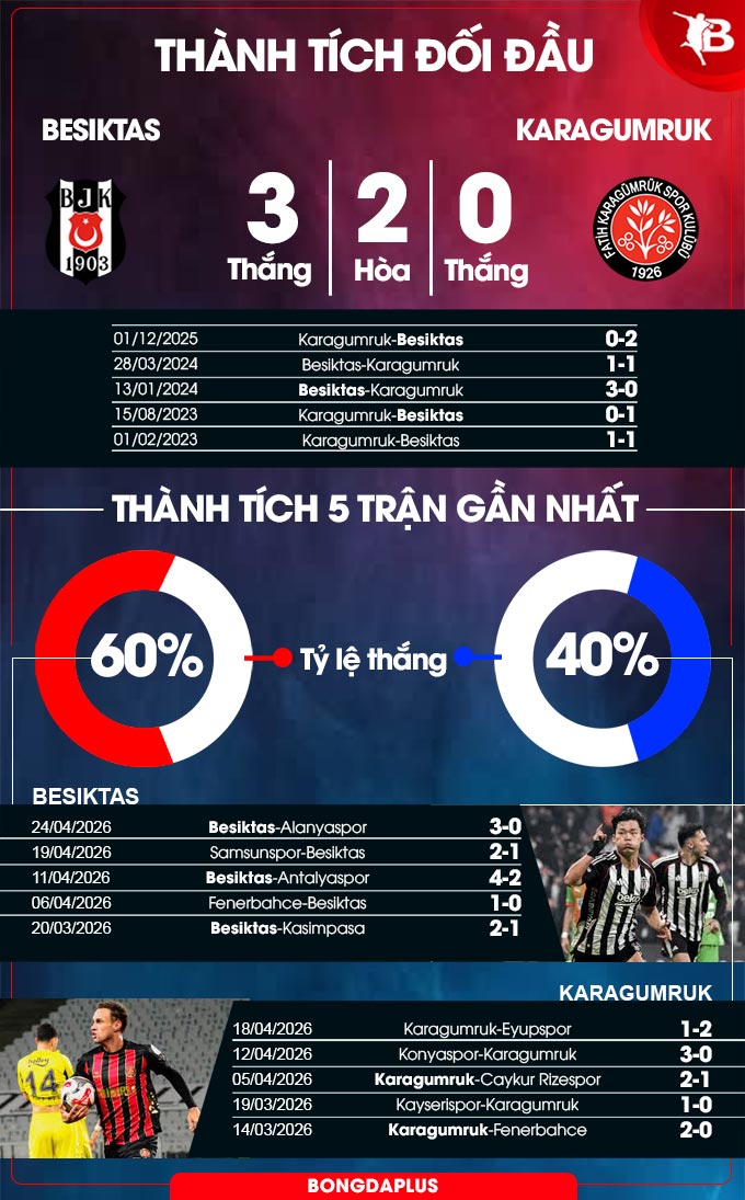 Xét về thành tích đối đầu, Besiktas càng có lý do để tự tin do họ đã bất bại trong cả 9 trận gặp Karagumruk gần nhất, trong đó có có 6 thắng lợi. Phải đá trên sân của đối thủ được lịch sử ủng hộ như vậy, khả năng cao là Karagumruk sẽ phải ra về với 2 bàn tay trắng.
