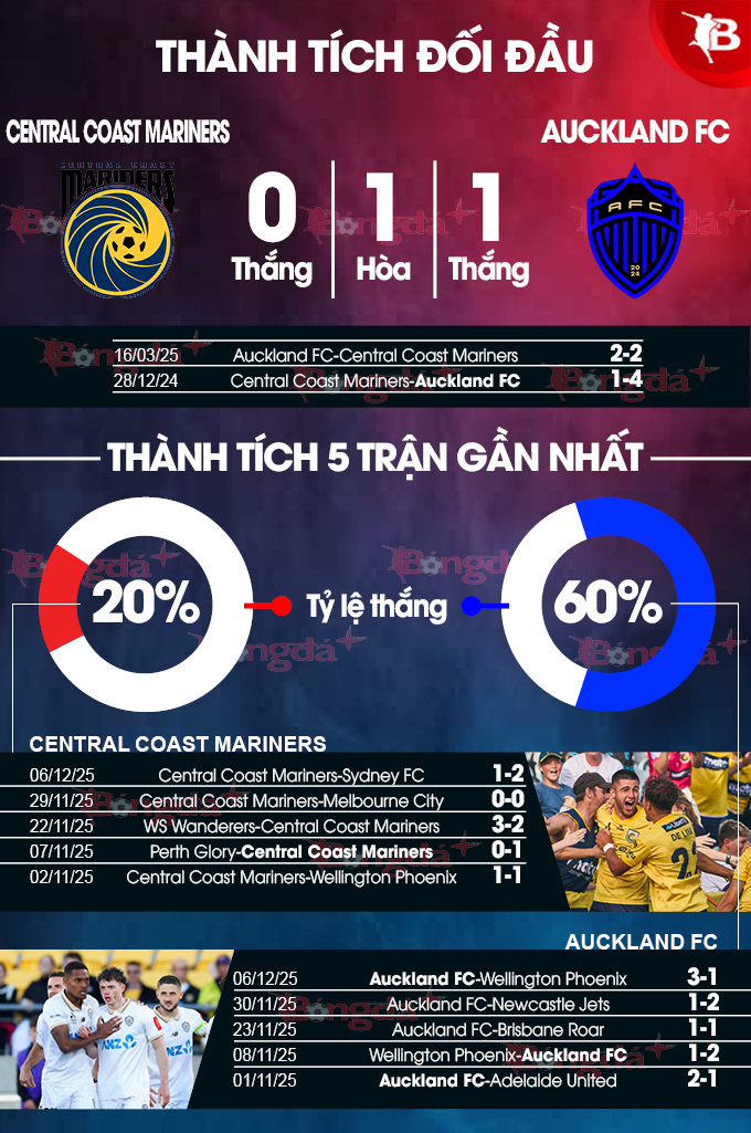 - Tối đa 3 bàn thắng: 5/6 trận gần đây của Central Coast cùng 10/11 trận vừa qua của Auckland FC đều có tối đa 3 bàn thắng được ghi. Với những gì hai đội đang thể hiện, kịch bản có nhiều nhất 3 pha làm bàn khả năng sẽ xuất hiện.