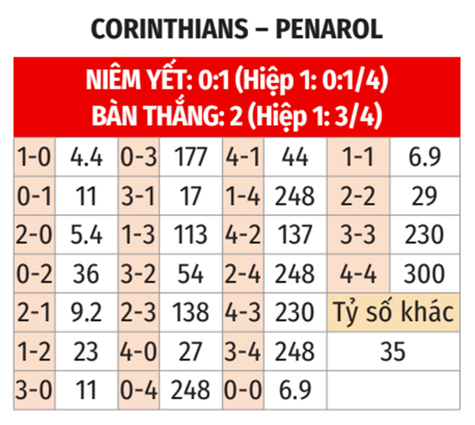 - Chẵn bàn thắng: Cả 2 trận đối đầu giữa hai đội, 9/12 trận gần đây của Corinthians và 6/9 trận vừa qua của Penarol đều có tổng bàn thắng là chẵn.