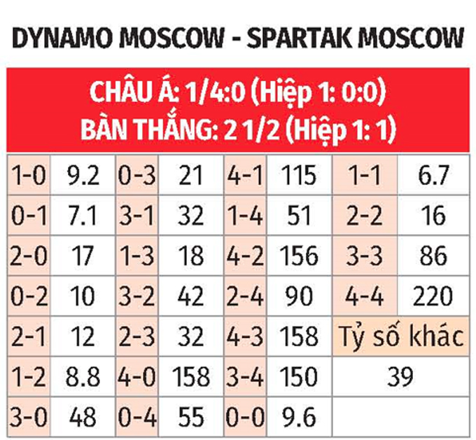 - Chẵn bàn thắng: 6/10 trận đối đầu vừa qua giữa 2 CLB có tổng bàn thắng chia hết cho 2. 6/10 trận sân nhà vừa qua của Dynamo Moscow chứng kiến điều tương tự. Ngoài ra, 4/6 lần họ tiếp Spartak Moscow trên sân nhà có tổng bàn thắng là số chẵn.