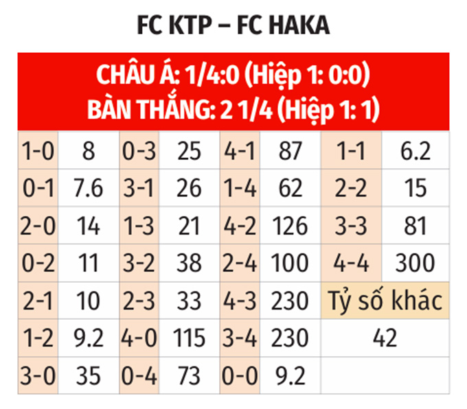 - Có bàn thắng cuối hiệp 1: 7/10 cuộc đối đầu gần nhất giữa hai đội, 10/11 trận gần đây của FC KTP và 8/11 trận vừa qua của FC Haka đều khép lại với ít nhất 1 bàn thắng từ phút16-45 của hiệp 1.