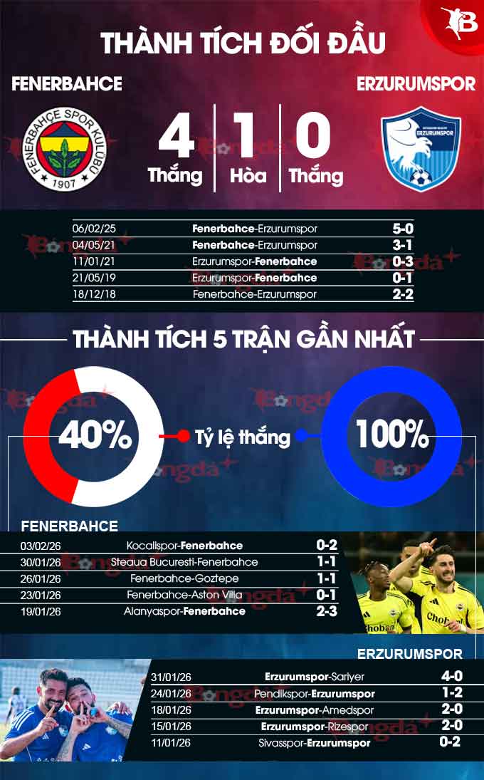 Tuy nhiên, Fenerbahce sẽ phải tập trung cao trước Erzurumspor bởi đối thủ đang có phong độ tốt khi toàn thắng 5 trận vừa xong. Trong khi đó, Fenerbahce chỉ thắng 2, thua 1 và hòa 2 ở cùng thời gian. Trên sân nhà, Fenerbahce thắng 5, hòa 3 và thua 2 ở 10 trận gần nhất, còn Erzurumspor chỉ thắng 4/10 trận sân khách vừa xong (tính trong 90 phút).