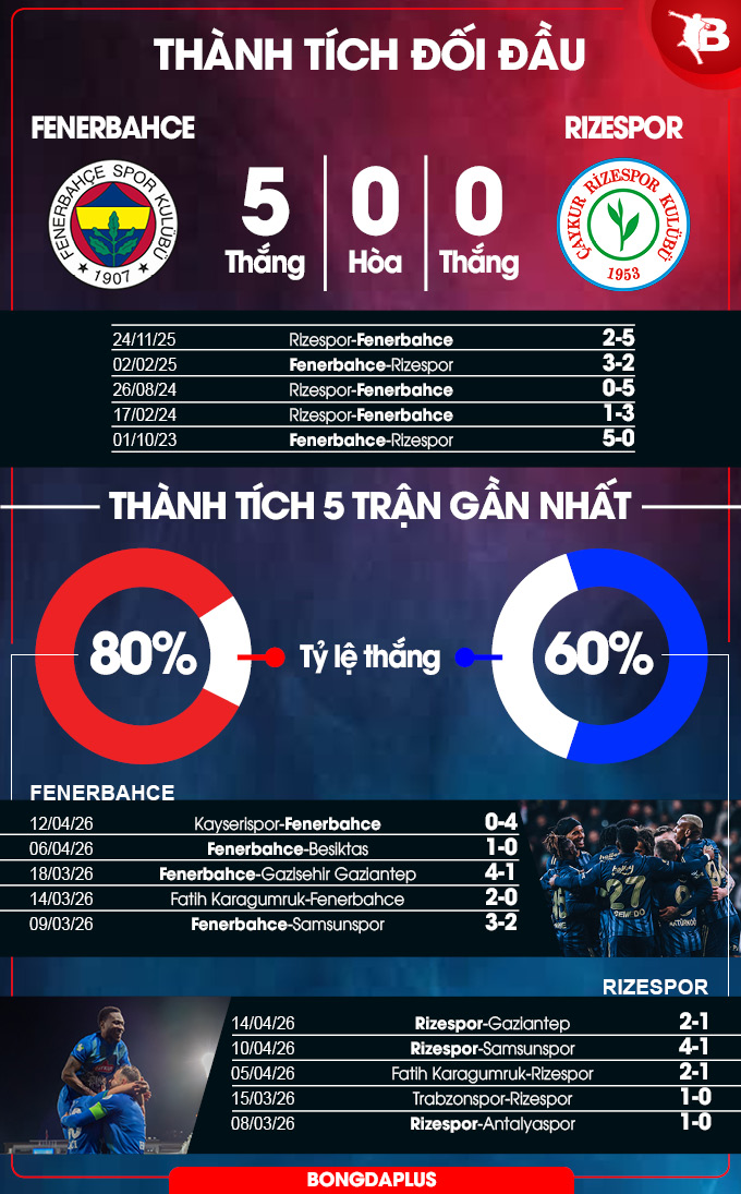 Fenerbahce áp đảo hoàn toàn Rizespor về đối đầu. Cụ thể, họ toàn thắng ở cả 13 lần đụng độ gần nhất, toàn thắng ở cả 10 cuộc đón tiếp Rizespor trên sân nhà vừa qua.