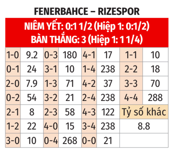 - Lẻ bàn thắng: 5/7 cuộc đối đầu gần nhất, 4/5 trận gần đây của Fenerbahce và cả 7 trận vừa qua của Rizespor đều có tổng bàn thắng là lẻ.