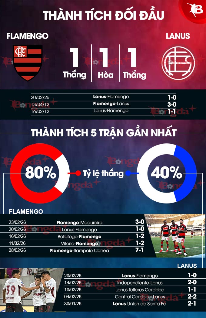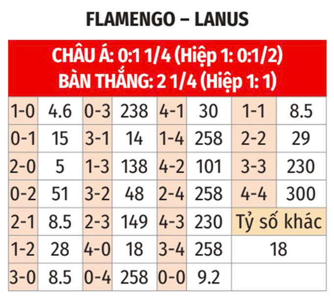- Flamengo thắng theo châu Á: Flamengo thắng 3, hòa 1, thua 1 ở 5 trận gần nhất; thắng 3/4 trận sân nhà gần đây. Còn Lanus thua 2/3 trận vừa qua.