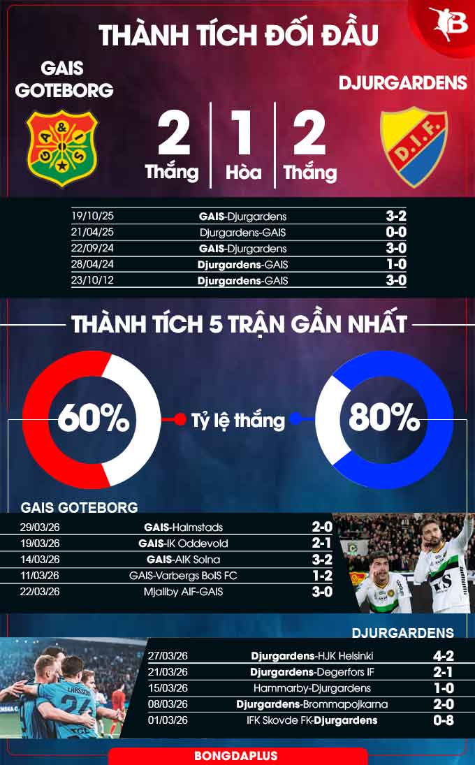 Về phần mình, Djurgardens dù chơi không tồi vẫn kém GAIS 2 bậc với 3 điểm ít hơn (49 so với 52) ở mùa 2025. Xét về thành tích đối đầu, Djurgardens có lý do để lo ngại do họ đã trải qua 3 trận liên tiếp toàn hòa và thua trước GAIS, trong đó có cả thất bại tan nát với tỷ số 0-3.