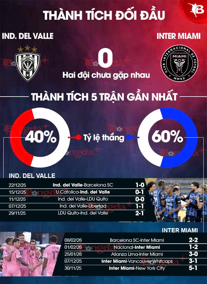 - Từ 2 tới 3 bàn: 6/10 trận gần đây của Ind. del Valle đều có từ 2 tới 3 bàn. 10 trận gần nhất của Inter Miami cũng có kết quả tương tự.