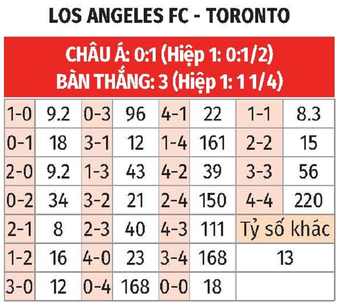 - LAFC thắng châu Á hiệp 1: Các cầu thủ LAFC đang nhập cuộc rất chủ động sau tiếng còi khai cuộc, khi thắng theo cả chuyên môn và châu Á ở 4/5 trận đấu gần đây trong hiệp đầu. Với Toronto, đội khách thua ngay hiệp đầu ở 2/3 trận vừa qua.