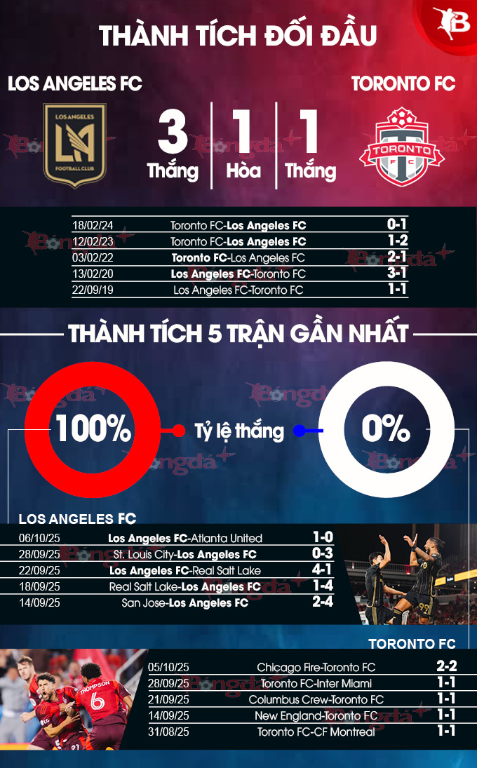 LAFC có thành tích đối đầu khá tốt với Toronto FC khi giành chiến thắng 3/4 lần gặp nhau gần nhất, mặc dù tất cả đều là trận giao hữu cấp câu lạc bộ. Riêng tại MLS, đây sẽ là cuộc đụng độ đầu tiên giữa hai câu lạc bộ kể từ năm 2018, nhưng LAFC vẫn nắm giữ lợi thế trong giải đấu này vì họ bất bại trong 2 lần đối đầu duy nhất trong lịch sử.