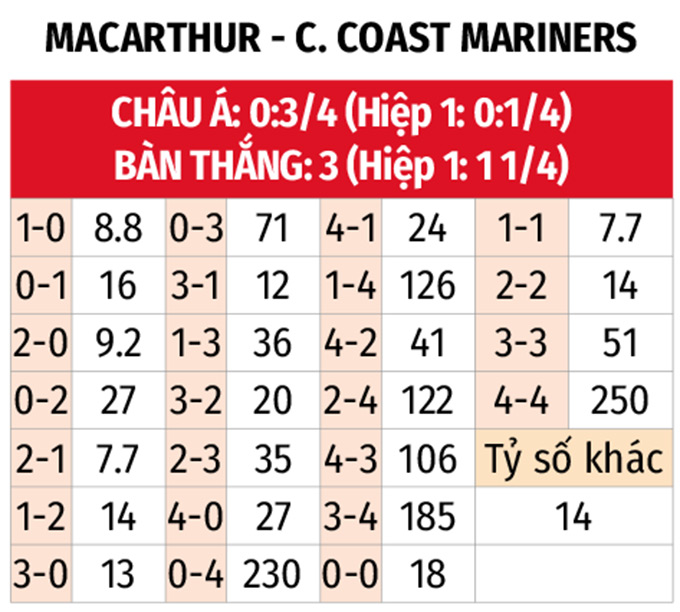 Ít nhất 1 bàn hiệp 1: 6/7 trận gần đây của Macarthur cùng 4/5 trận vừa qua của Central Coast đều có ít nhất 1 bàn thắng được ghi. 3/4 trận đối đầu gần nhất cũng xuất hiện tối thiểu 1 bàn trước giờ nghỉ. Có thể chờ giảm tổng bàn thắng từ 1 1/4 về 1 để cổ vũ mưa bàn thắng trong hiệp đầu.