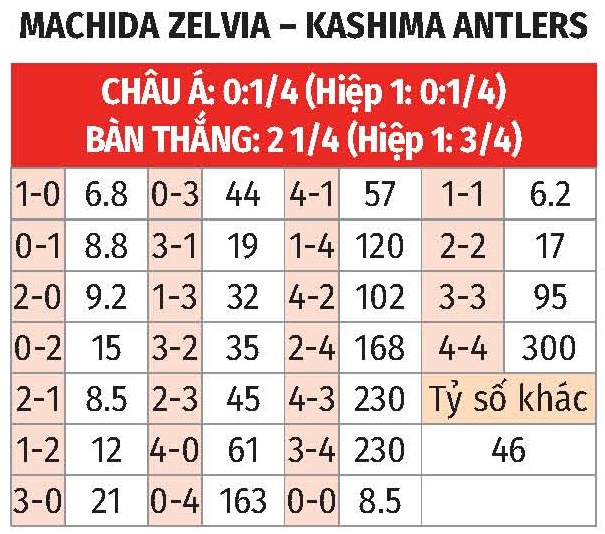 - Lẻ bàn thắng: 6/9 trận gần đây của Kashima Antlers cùng 3/4 trận vừa qua của Machida đều có tổng bàn thắng là lẻ. Kịch bản lẻ bàn thắng cũng diễn ra ở 3 trận đối đầu gần nhất giữa 2 đội.