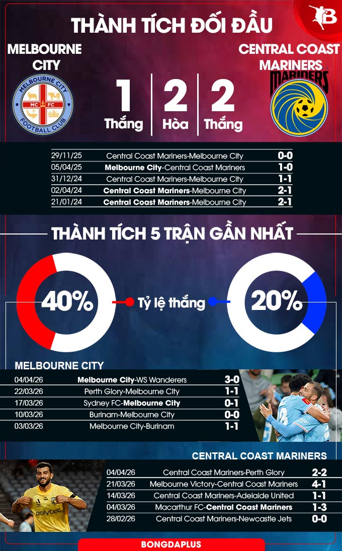 Trong khi Melbourne City thắng 3/10 trận gần nhất thì Central Coast Mariners chỉ thua 1/10 trận vừa xong.