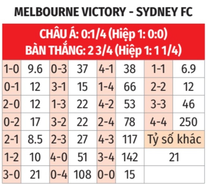- Tối đa 1 bàn hiệp 1: 9/11 trận đấu gần đây của Melbourne Victory chỉ có nhiều nhất 1 bàn thắng trong hiệp 1. Tình trạng tương tự xảy ra ở 8/9 trận vừa qua của Sydney FC.