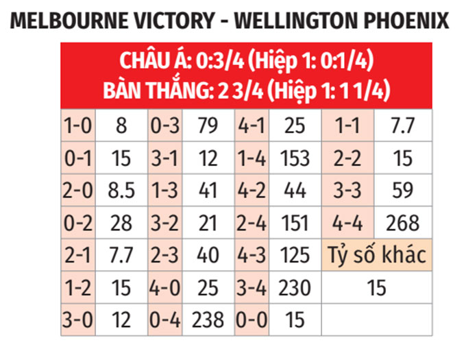 - Không quá 2 thẻ vàng: 3/4 trận gần nhất giữa Melbourne Victory và Wellington Phoenix đều có không quá 3 thẻ vàng. 4/5 trận vừa qua của Wellington Phoenix cũng diễn ra theo kịch bản tương tự.