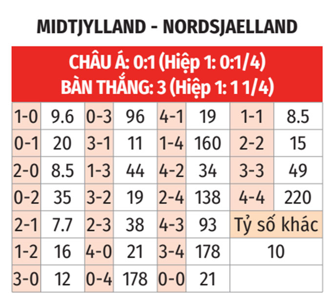 - Midtjylland thắng theo châu Á: Nordsjaelland đang tỏ ra kém duyên vì mới thua theo châu Á ở 3/4 trận gần nhất. Đá với Midtjylland thắng theo châu á ở 5/7 cuộc đụng độ gần đây giữa 2 bên, Nordsjaelland không phải là sự lựa chọn đáng tin cậy.