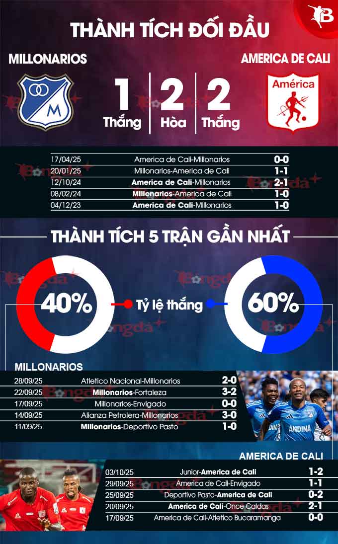 - 2 hoặc 3 bàn cả trận: 2/3 cuộc đối đầu gần nhất, 3/4 cuộc đụng độ gần đây giữa hai đội tại sân El Campin cũng có 2 hoặc 3 bàn mỗi trận. Hơn nữa, cả 4 trận vừa qua của America de Cali cũng có kết cục tương tự.