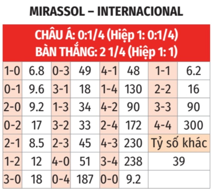 - Tối thiểu 1 bàn thắng hiệp 1: Cả 11 trận đấu gần đây của Mirassol đều có từ 1 bàn thắng trở lên trong hiệp 1. Tình trạng tương tự xảy ra ở 16/17 trận vừa qua của Internacional.