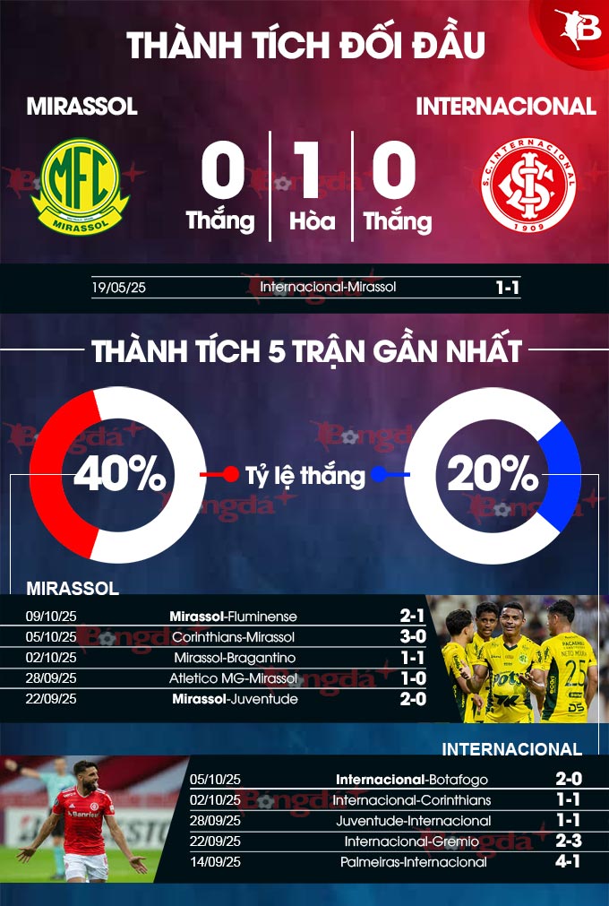 Trong khi đó, Intenacional đang kém Mirassol tới 11 bậc tại bảng xếp hạng. Theo thống kê, đội khách chỉ giành được 8 trận thắng sau 26 lượt trận. Đặc biệt, Internacional rất yếu bóng vía trên sân khách. Những con số không biết nói dối, Internacional không thắng trong 4 chuyến hành quân trở lại đây, trong đó họ phải nhận 3 thất bại.