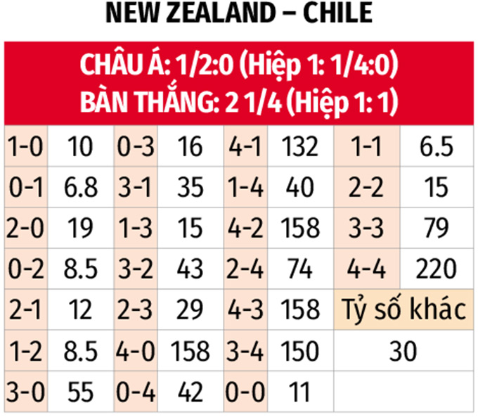 - Ít nhất 1 bàn hiệp 1: 3/4 trận gần đây của New Zealand đều có ít nhất 1 bàn thắng được ghi trong hiệp đầu tiên. Với Chile, trận gần nhất với Cape Verde có tới 3 bàn trước giờ nghỉ, đồng thời 7/8 trận gần nhất có tối thiểu 1 bàn trong hiệp 1.