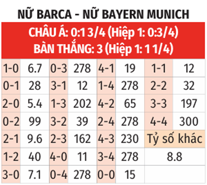 - Chẵn bàn thắng: 8/10 trận chính thức gần nhất của nữ Barca có tổng bàn thắng chia hết cho 2. Ngoài ra, 7/10 trận chính thức vừa qua của nữ Bayern chứng kiến điều tương tự.