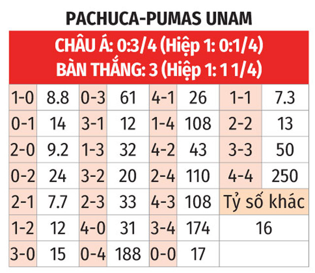 - Pumas ghi ít nhất 1 bàn trong hiệp 1: Ở 4/6 trận gần nhất, Pumas đều xuyên thủng lưới đối phương ít nhất 1 lần trong 45 phút đầu tiên. Ngoài ra, Pachuca cũng để thủng lưới ở hiệp 1 trong 3/4 trận vừa qua.