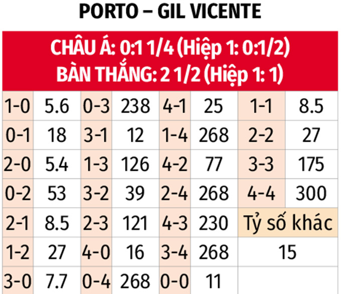 - Ít bàn thắng: 5 trận liên tiếp của Porto cùng 6/9 trận vừa qua của Gil Vicente đều có tối đa 2 bàn thắng. 6/9 trận đối đầu gần nhất giữa 2 đội trên sân Dragao cũng có nhiều nhất 2 lần lưới rung.