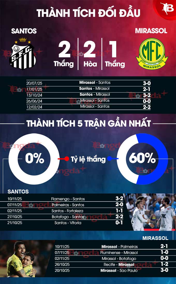 Cũng theo thống kê, Santos áp đảo Mirassol khi tiếp đón đối thủ này. Bằng chứng là trong 9 trận sân nhà gần đây trước Mirassol, họ áp đảo gần như tuyệt đối với thành tích hòa 1 và thắng 8 trận, gần nhất là chiến thắng 2-1 hồi đầu năm nay.