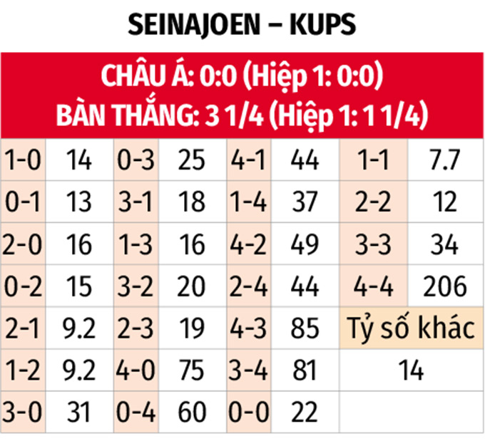 - Từ 4 bàn thắng trở lên: 4/6 trận đấu gần đây của cả Seinajoen và KuPS đều có từ 4 bàn thắng trở lên. Kịch bản này cũng diễn ra ở trận đối đầu gần nhất với 5 pha làm bàn.