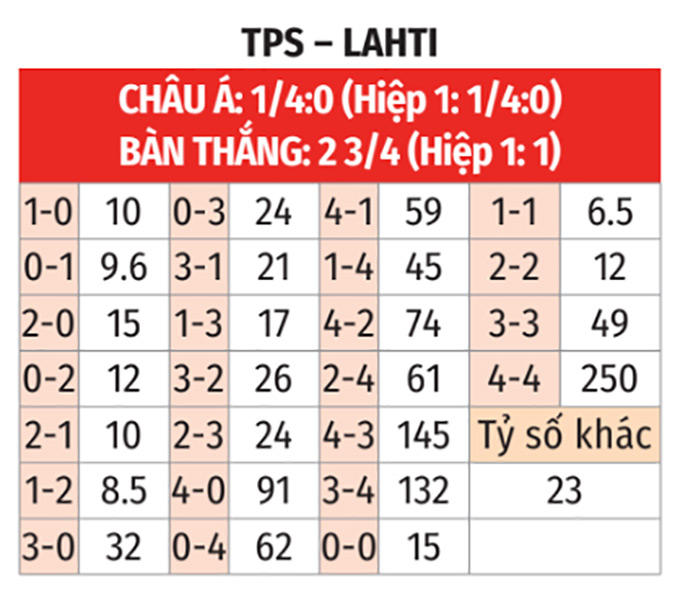 - Tỷ số chẵn: Cả 4 trận gần đây giữa TPS Turku và Lahti đều kết thúc với tỷ số chẵn. 6/8 trận vừa qua của TPS Turku và 5/6 trận gần nhất của Lahti cũng có số bàn thắng chia hết được cho 2.