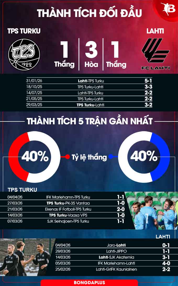 Xét về thành tích đối đầu, TPS Turku càng có lý do để e ngại Lahti, đội khiến họ chỉ biết hòa và thua ở 8/9 cuộc đụng độ gần nhất giữa 2 bên. Căn cứ vào thực tế trên, nếu TPS Turku có gục ngã trước Lahti dù được chơi trên sân nhà thì đây cũng không phải là chuyện lạ.