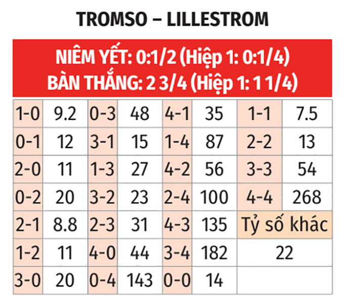 - Tỷ số chẵn: 4/5 trận sân nhà vừa qua của Tromso kết thúc với tỷ số chẵn. 8/10 trận gần nhất của Lillestrom cũng có số bàn thắng chia hết cho 2.