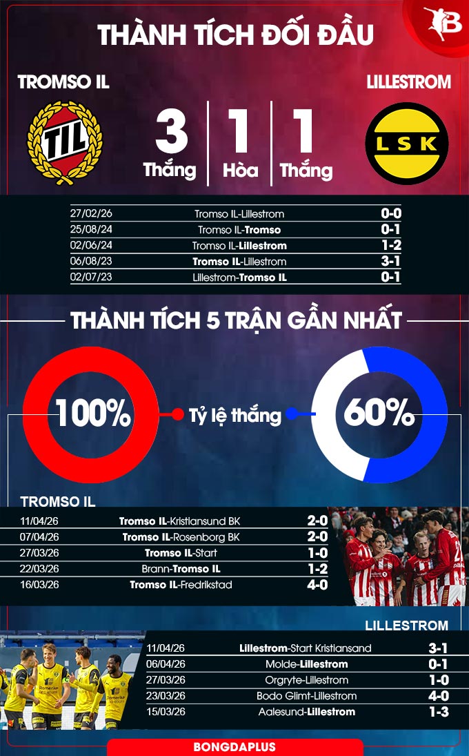 Xét về thành tích đối đầu, Tromso càng có lý do để tự tin do họ chỉ thua Lillestrom có 1 lần trong 10 cuộc đụng độ gần nhất giữa 2 bên. Cộng thêm lợi thế sân nhà, mục tiêu kiếm trọn 3 điểm xem ra không quá khó để Tromso thực hiện.