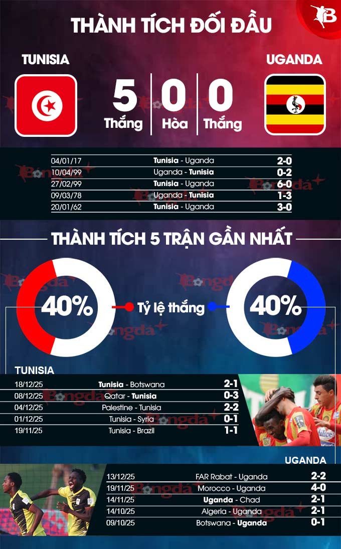 - Hai đội cùng ghi bàn: 5/7 trận gần đây của Tunisia và 3/4 trận vừa qua của Uganda đều có ít nhất 1 bàn thắng cho mỗi đội. Hơn nữa, 5/6 trận gần đây trên sân trung lập của Tunisia cũng đều khép lại mà không đội nào giữ sạch lưới nhà.