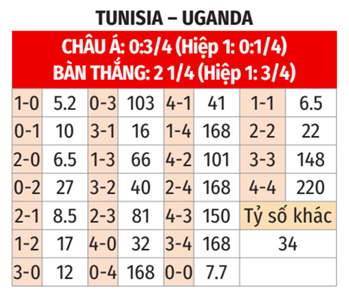 - Tunisia thắng theo châu Á: Tunisia thắng cả 5 cuộc đối đầu giữa hai đội, thắng 7/9 trận chính thức gần đây. Trong khi đó, Uganda không thắng 6/9 trận vừa qua, thua cả 3 trận xa nhà gần nhất. Vì thế, giới mộ điệu có thể đặt niềm tin ở Tunisia trận này.
