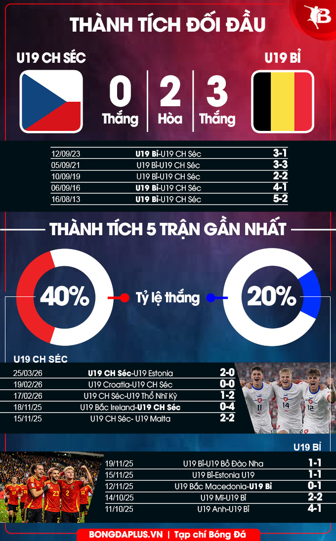 Đáng chú ý, lịch sử đối đầu đang hoàn toàn chống lại U19 CH Séc. Trong 5 lần gặp nhau gần nhất, họ đã rất cố gắng nhưng vẫn không sao thắng nổi U19 Bỉ (hòa 2, thua 3). Thậm chí 3 thất bại của U19 CH Séc đều có cách biệt từ 2 bàn trở lên. Rõ ràng, “cái dớp” trước U19 Bỉ là rào cản tâm lý không nhỏ. Với phong độ cao và sự áp đảo về đối đầu, nhiều khả năng U19 Bỉ sẽ tiếp tục được hưởng niềm vui khi so tài với U19 CH Séc.