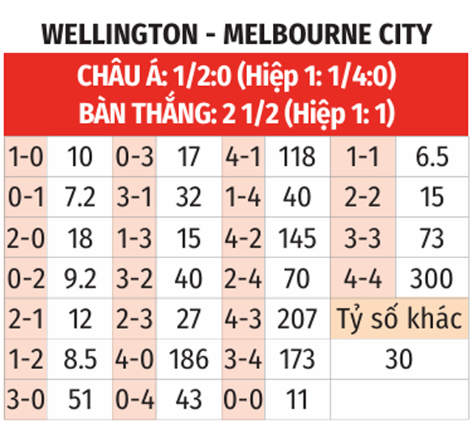 Riêng 5 trận gần nhất làm khách trước Wellington Phoenix, Melbourne City thắng 4 và thua 1. Chưa hết, 7 lần gần nhất gặp nhau, Melbourne City thắng 6 và thua 1. Nhiều khả năng, 3 điểm sẽ lại đến với Melbourne City ngay tại sân Sky.