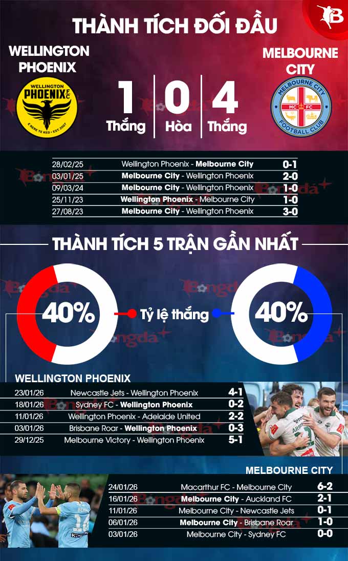 Phong độ của Wellington Phoenix và Melbourne City không có sự chênh lệch vào lúc này khi cùng thắng 2/5 trận gần nhất. Trên sân nhà, Wellington Phoenix thắng 5/9 gần nhất còn Melbourne City thắng 3, hòa 4 và thua 2 ở cùng thời gian.