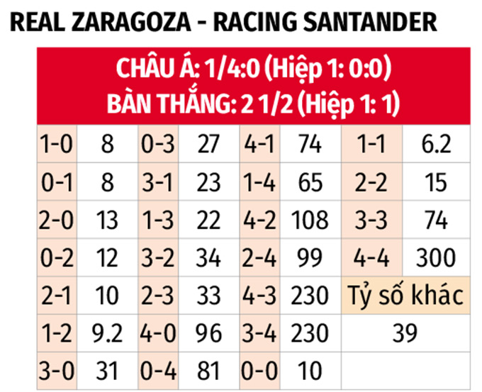 - Lẻ bàn thắng: 8/9 trận vừa qua của Racing Santander cùng 4/5 trận gần đây của Zaragora đều kết thúc với tổng bàn thắng là lẻ. Kịch bản lẻ bàn thắng cũng diễn ra ở 4/6 trận đối đầu gần nhất.