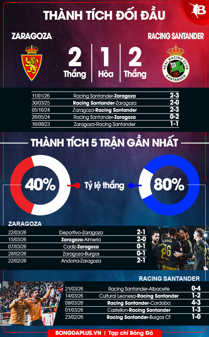 - Nhiều bàn thắng: 2/3 trận đối đầu gần nhất giữa đôi bên, bao gồm trận gặp nhau ở lượt đi kết thúc với 5 bàn thắng mỗi trận. Với Racing Santander, 5/6 trận vừa qua cùng trận đấu gần đây của Zaragora cũng xuất hiện ít nhất 3 pha làm bàn.