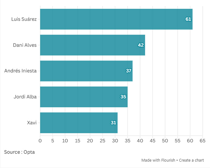 Trong 900 bàn thắng của Messi, không thể bỏ qua vai trò của các đồng đội đã kiến tạo. Những cầu thủ như Luis Suarez (61 kiến tạo cho Messi), Dani Alves (42), Andres Iniesta (37), Jordi Alba (35), Xavi Hernandez (31), hay sau này là các đối tác tại PSG và Inter Miami đóng vai trò quan trọng trong việc cung cấp cơ hội.