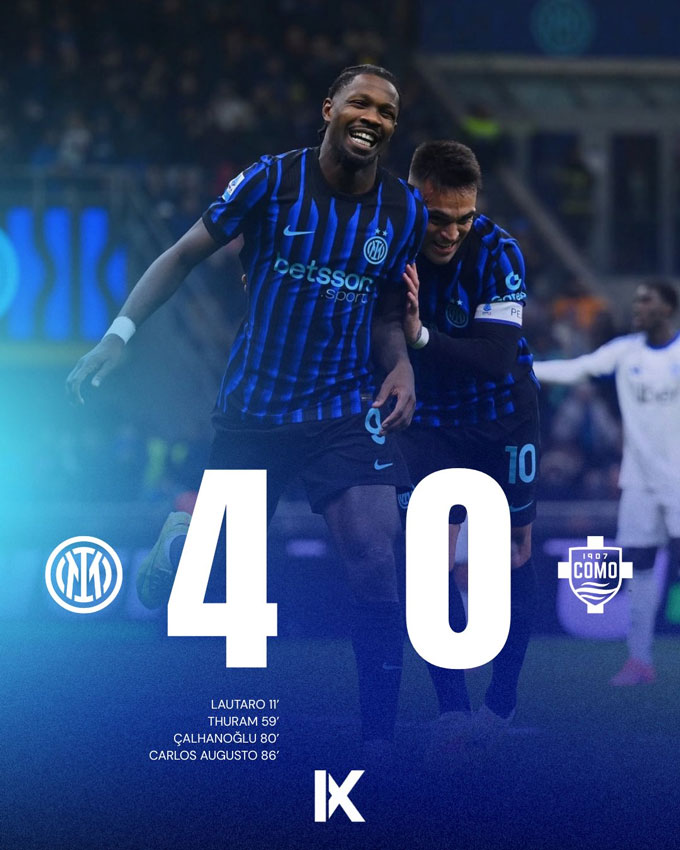 Carlos Augusto ghi thêm bàn ở phút 86, ấn định tỷ số 4-0 đậm đà. Chiến thắng thứ 7 trong 9 trận trên mọi đấu trường đưa Inter tạm trở lại ngôi đầu Serie A. Trong khi đó, chuỗi 12 trận bất bại của Como đã bị chặn đứng.