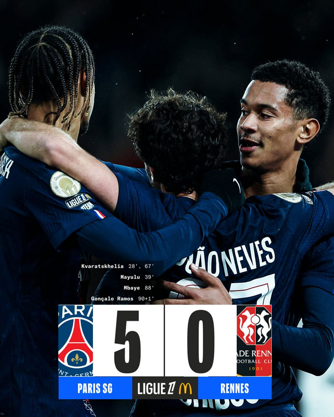 Tại vòng 15 Ligue 1, PSG được thi đấu trên sân nhà tiếp đón Rennes. Đội chủ nhà nhập cuộc nhanh, tấn công dồn dập. Nhưng phải đến phút 28, họ mới có bàn mở tỷ số nhờ công của Kvaratskhelia. Trước khi hiệp 1 khép lại, PSG gia tăng cách biệt khi Mayulu cụ thể hóa đường kiến tạo của Neves.