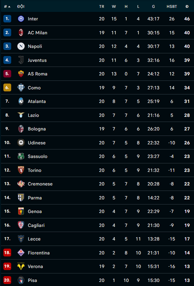 Napoli bị cầm chân là tin vui cho Inter. Tại vòng 20 Serie A, Inter đã phải nhờ đến màn tỏa sáng của Francesco Pio Esposito để đánh bại Lecce với tỷ số tối thiểu 1-0. Cụ thể là vào phút 78, từ cú dứt điểm sấm sét của Martinez khiến thủ môn Falcone không thể bắt dính bóng, tài năng trẻ Esposito xuất hiện đúng lúc để đá bồi cận thành, khai thông thế bế tắc. Thắng lợi tối thiểu giúp Inter Milan tiếp tục giữ ngôi đầu bảng, nắm giữ lợi thế lớn trong cuộc đua đến ngôi vô địch Serie A.
